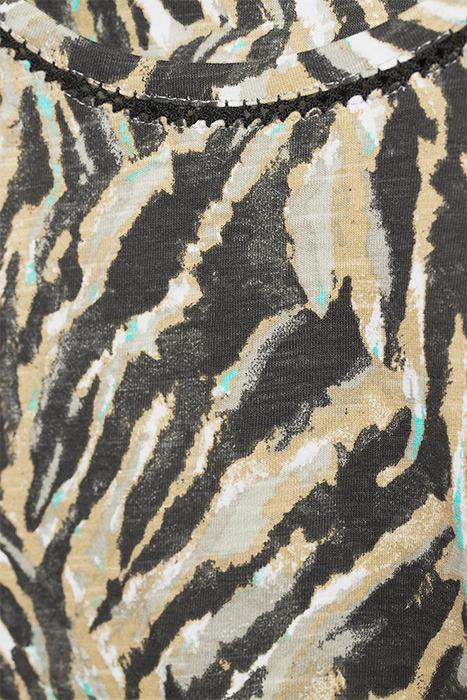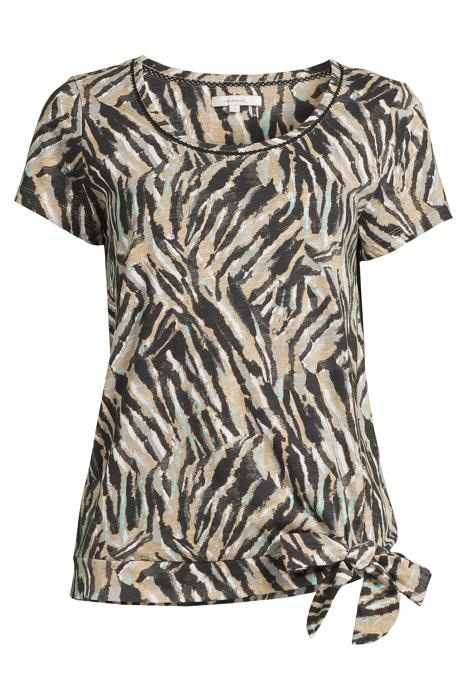 Dit T-shirt is voorzien van een all-over grafische print. We hebben aan dit shirt een knoopdetail aangebracht, wat het shirt nog leuker maakt. De top is voorzien van een ronde hals met ajour details en korte mouwen.