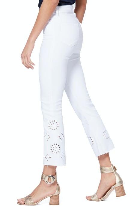 Your must-have silhouette for this season. Fitting slim, these stark, all white jeans feature comfort stretch fabric and a butter-soft hand feel. With leg embroidery, raw hems, a feminine twill line, white hardware and a white back patch.