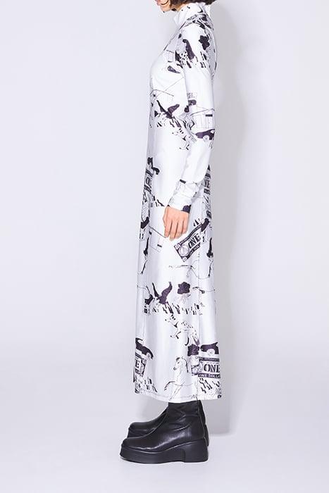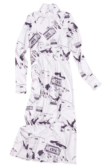 Long Dress With Route 66 Print In White. Straight-Cut Model, High Neck And Long Sleeves. Back Zip Fastener.