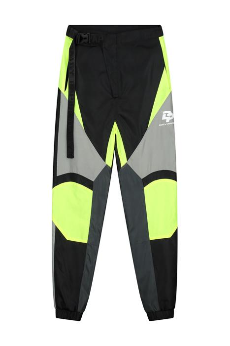 The motocross-inspired Girt pants constructed of a technical fabric panels of black, neon-yellow and reflective fabric. The pants feature uniquely placed logos, a small Daily Paper logo on the front left leg and a large logo artwork on the back. Completed with an elastic waist at the back, a short industrial belt at the right front side, and an elastic hem at the ankles.