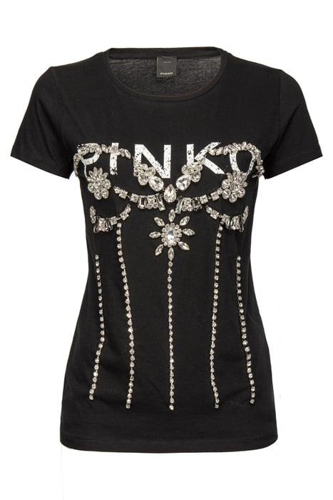 Short-Sleeved Cotton Jersey T-Shirt With Printed Pinko Logo Embellished With Chaton-Jewel Embroidery At The Front.